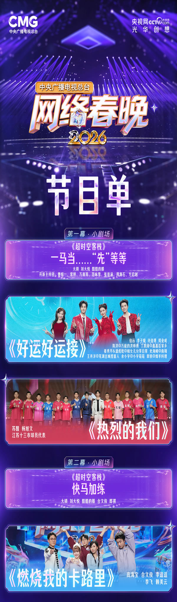 《中央广播电视总台2026网络春晚》 节目单抢先看!今天20点档,CCTV-1综合频道、CCTV-3综艺频道及央视网、央视频、央视新闻、央视财经、央视文艺等总台新媒体矩阵同步播出。