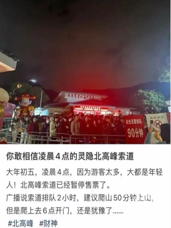 网友“米秋米秋”凌晨3点到北高峰山脚下,准备走游步道爬山上财神庙,现场已经人山人海。