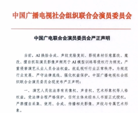 当前,AI换脸合成、声纹克隆复刻、影视素材任意篡改、魔改、擅自抓取演员影像声频用于AI模型训练等侵权行为频发,严重侵害演艺从业人员合法权益,扰乱视听行业正常秩序。为规范行业发展、严守法律底线、强化权益保护,中国广播电视社会组织联合会演员委员会现发布严正声明: